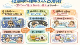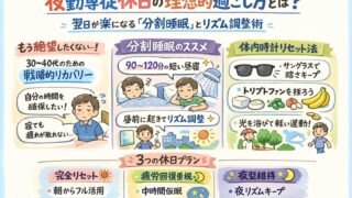 夜勤明けに寝付けない、疲れが抜けない30〜40代の方へ。科学的根拠に基づいた「睡眠リズム改善タイムスケジュール」を解説。サングラスでの遮光や2段階睡眠法など、過酷なシフト勤務でも深い眠りを取り戻す具体的なコツを紹介します。