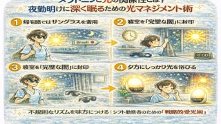夜勤明けに眠れない原因は、光が「脳の親時計」を刺激し、睡眠ホルモンを止めるから。サングラスや遮光カーテンを活用し、メラトニンを守る「光マネジメント」を専門家が解説。シフト勤務でも熟睡できるコツを伝授します。