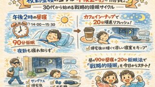 夜勤の昼寝にはコツがある!30〜40代のシフト勤務者に贈る、最新睡眠科学に基づいた「戦略的仮眠」の全技術。午後2時の昼寝の重要性から、夜勤明けにぐっすり眠るための光対策まで。疲れを溜めない働き方を手に入れましょう。