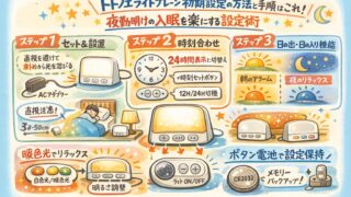 トトノエライトプレーンの初期設定方法を公式ガイドに基づき解説。時刻合わせや日の出・日の入り機能の手順、夜勤明けに最適な「暖色光」の活用術を紹介。24H表示への切り替えなど、シフト勤務者必見の設定ミス防止策も公開!