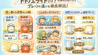トトノエライトとは?夜勤や交代制勤務で崩れたリズムを光で整える方法を解説。30〜40代の社会人が抱える悩みを解決する最新モデル「プレーン」と旧型の違いを比較表で紹介。アプリ不要の操作性や使い方のコツも網羅。
