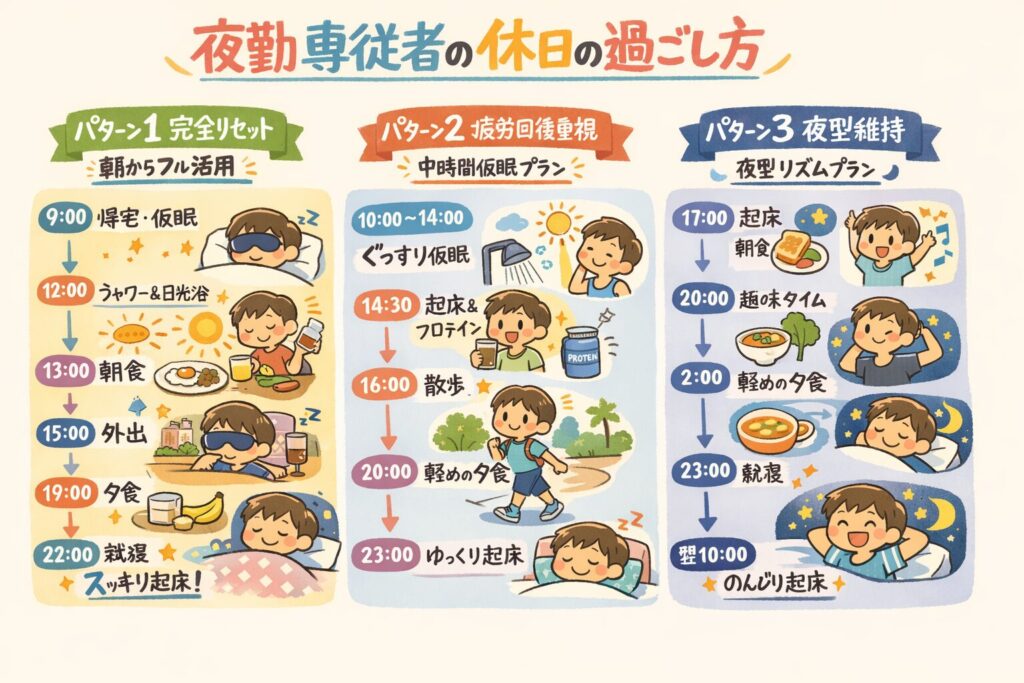 夜勤明け当日にリズムを強引に社会時間へ戻し、翌日の休日を家族や友人と過ごしたり、趣味に充てたりしたい方向け。