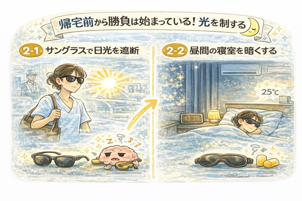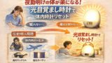 夜勤の体内時計を整える最大の鍵は、眼球から入る「光」の管理です。私たちの脳は、朝日を浴びた瞬間から「1日のスタート」を確信し、覚醒モードへ切り替わってしまいます。帰宅後に泥のように眠るためには、退勤の瞬間から脳を「夜の状態」に保つカモフラージュが必要になります。