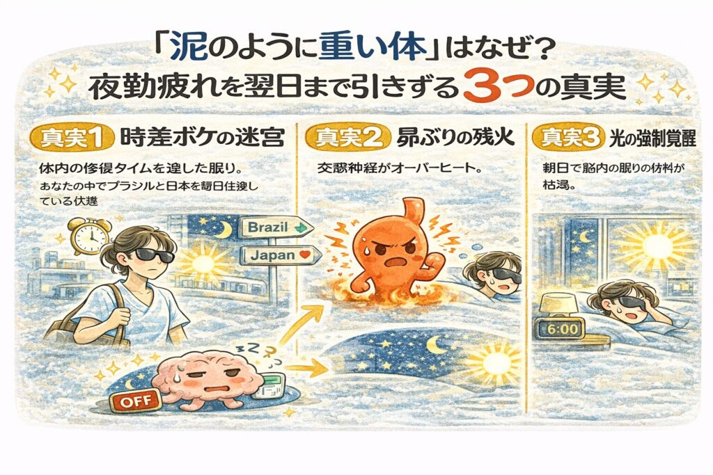 夜勤明けの疲れが抜けないのは、人体の神秘である「体内時計」と戦っているからです。その戦いに勝つのではなく、優しく「脳を騙す」こと。それがプロのリカバリー術です。