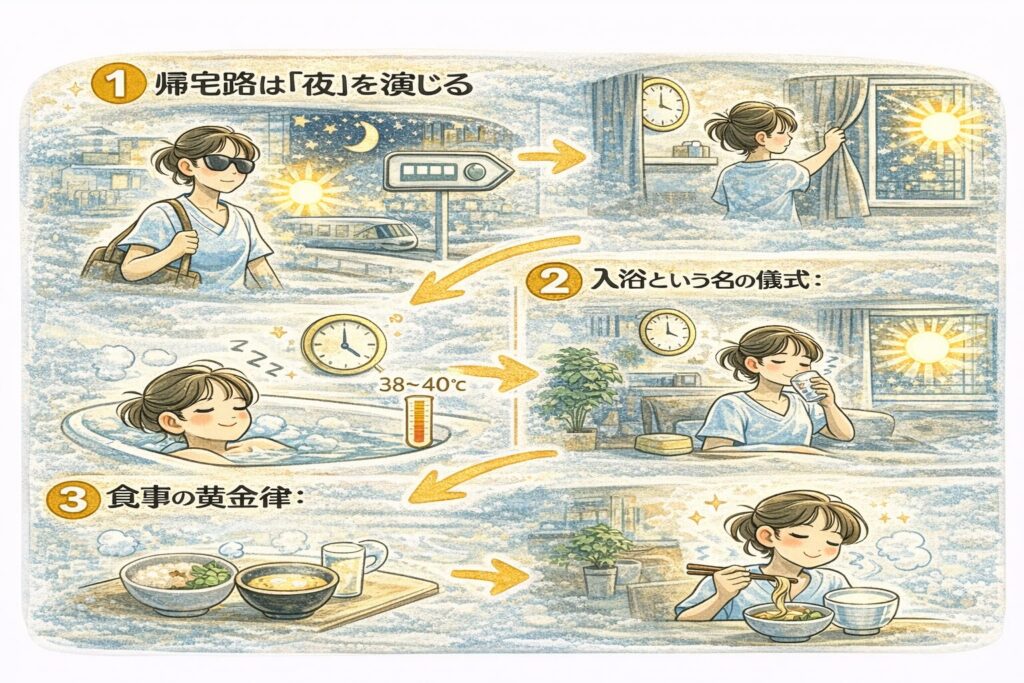交感神経がオーバーヒートしたまま布団に入っても、血管は収縮したままで深部体温が下がらず、脳は小さな物音にも過敏に反応し続けます。この「昂(たか)ぶりの残火」が深い眠り(徐波睡眠)を阻害し、筋肉の緊張や脳の倦怠感を翌日まで持ち越させるのです。休むためには、単に横になるのではなく、まず「戦闘モードを強制終了」させる手続きが必要になります。